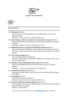 [To Parent Directory] 2/27/2025 6:05 PM 404281 Be tv - Les grilles de la semaine 06.pdf 2/27/2025 6:05 PM 1069 Be tv - Les grilles de la semaine 06_pdf_th_S.jpg 2/27/2025 6:05 PM 25250 Be tv - Les grilles de la semaine 06_pdf_th_X.jpg