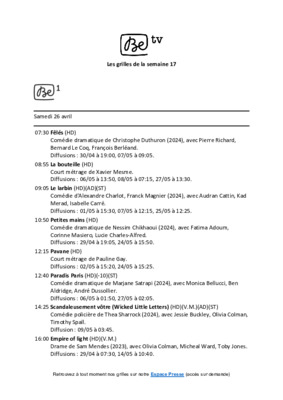 [To Parent Directory] 6/3/2025 11:02 AM 562731 Be tv - Les grilles de la semaine 17.pdf 6/3/2025 11:03 AM 1054 Be tv - Les grilles de la semaine 17_pdf_th_S.jpg 6/3/2025 11:03 AM 22160 Be tv - Les grilles de la semaine 17_pdf_th_X.jpg