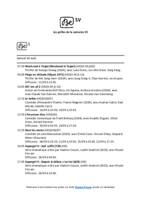 [To Parent Directory] 11/6/2025 10:34 AM 478668 Be tv - Les grilles de la semaine 35.pdf 11/6/2025 10:35 AM 1049 Be tv - Les grilles de la semaine 35_pdf_th_S.jpg 11/6/2025 10:35 AM 23088 Be tv - Les grilles de la semaine 35_pdf_th_X.jpg